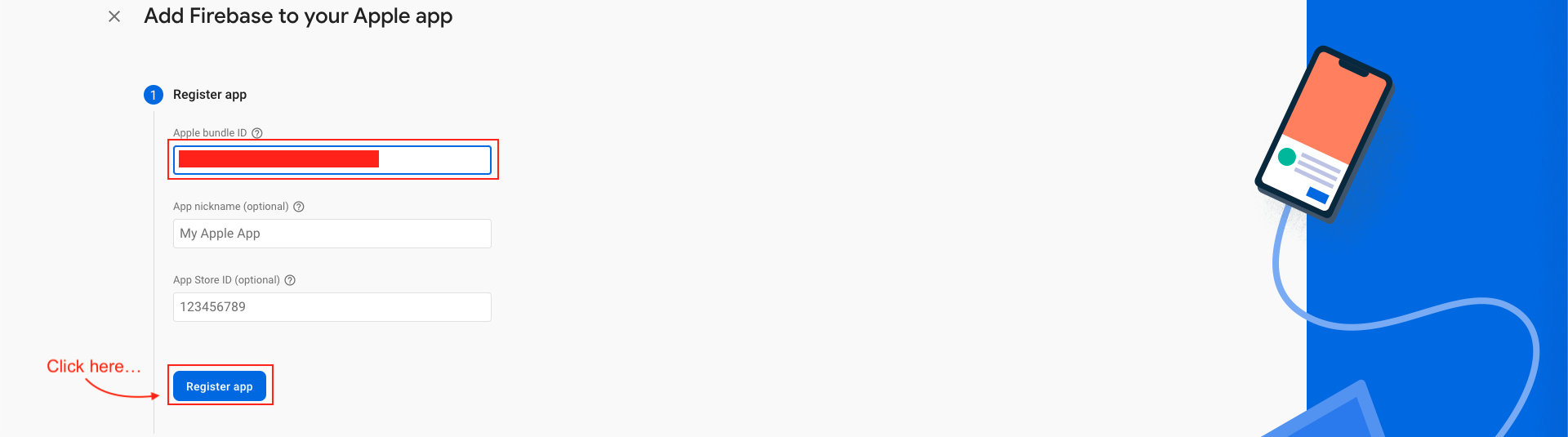 - On the next screen, enter your iOS bundle ID & App nickname and click on Register App. You can find your bundle ID in the General tab for your app's primary target in Xcode. If specified, the app nickname will be used throughout the Firebase console to represent this app. Nicknames aren't visible to users.