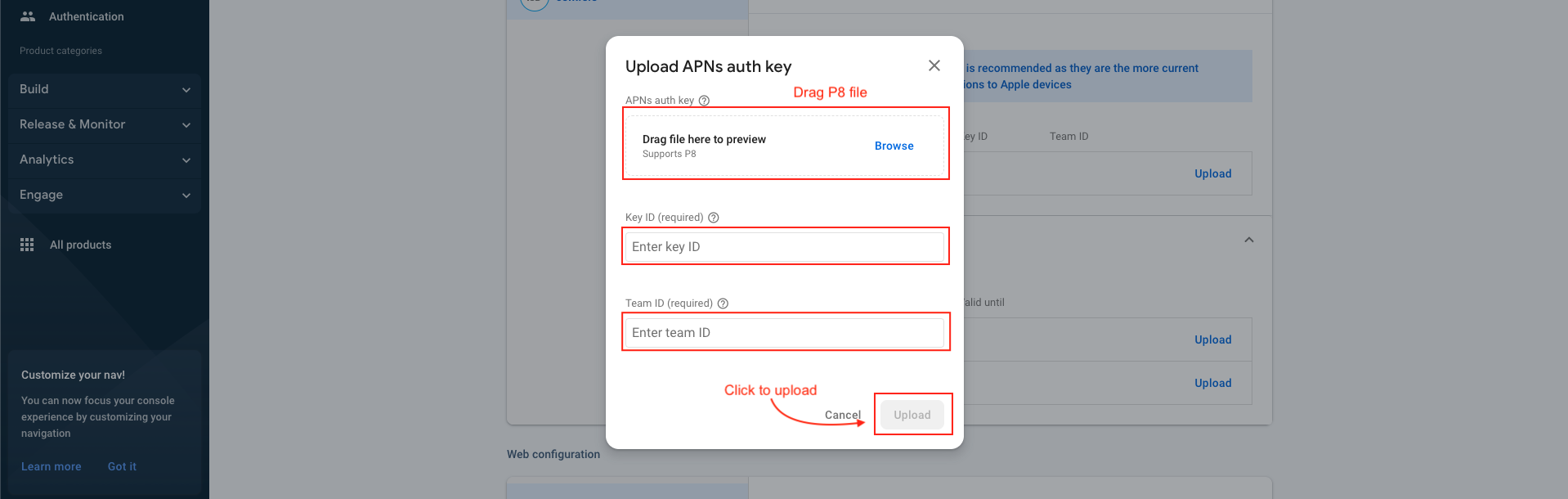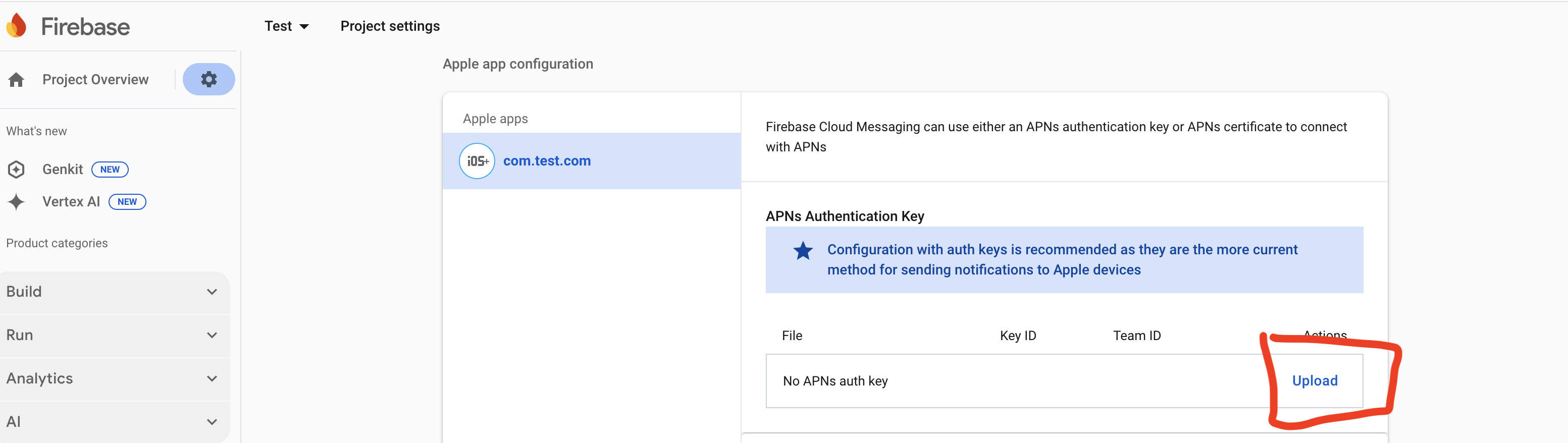 - The file & Key ID can now be added to your Firebase Project. On the Firebase Console, navigate to the "Project settings" and select the "Cloud Messaging" tab. Select your iOS application under the "iOS app configuration" heading.s
