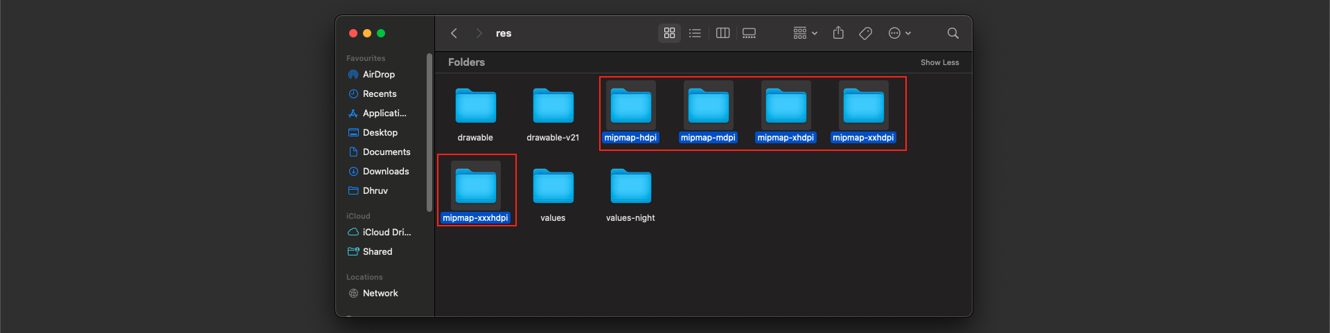 - Navigate to the "android/app/src/main/res" directory in your project. Right-click on the "res" folder and select "open in Finder". Once in Finder, delete all the existing mipmap folders. Then, paste the mipmap folders from the AppIcon/android directory that you have downloaded.