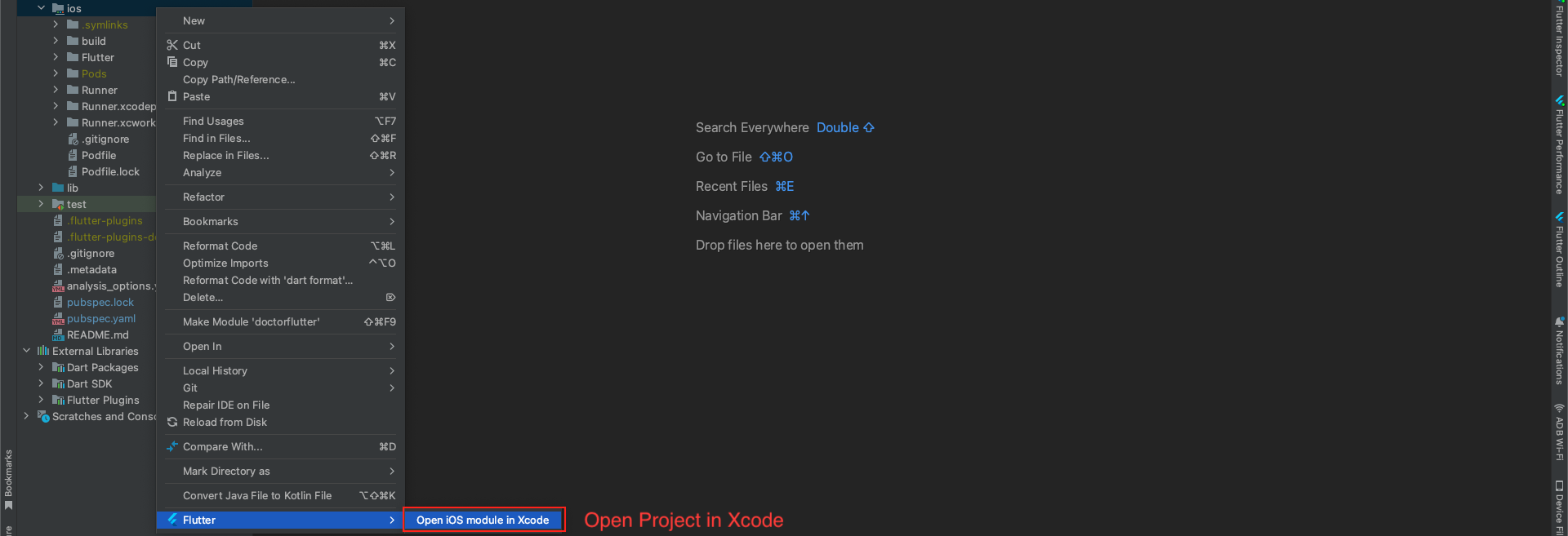 - Right-click on the iOS directory, select "Flutter" and then "Open iOS module in Xcode" to proceed further.
