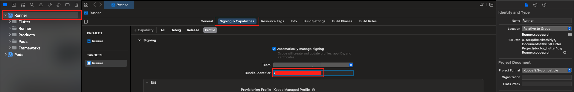 - Navigate to "Runner" > "Signing & Capabilities".