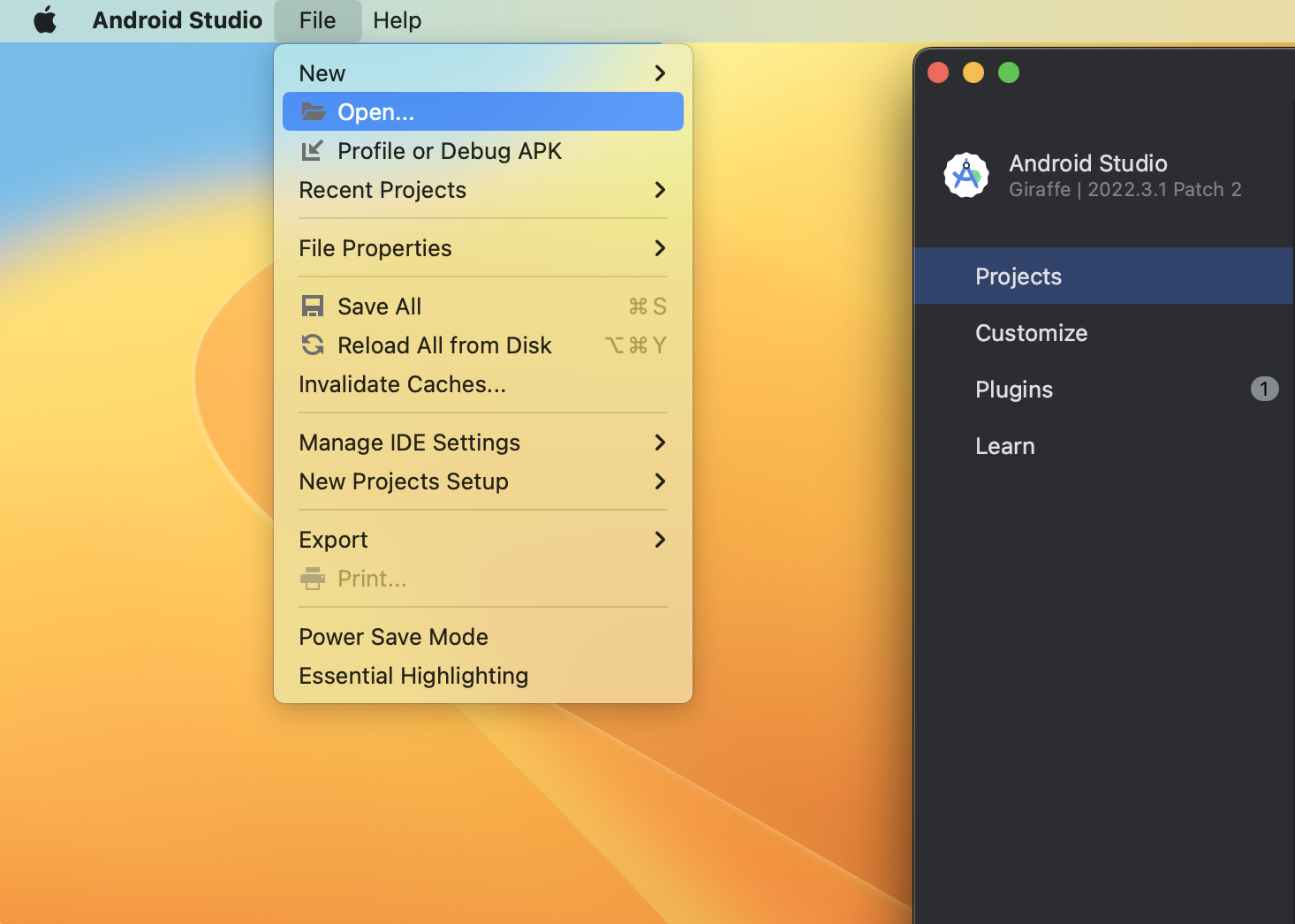 - Open Android Studio, at the top right corner, click on the "File" button.