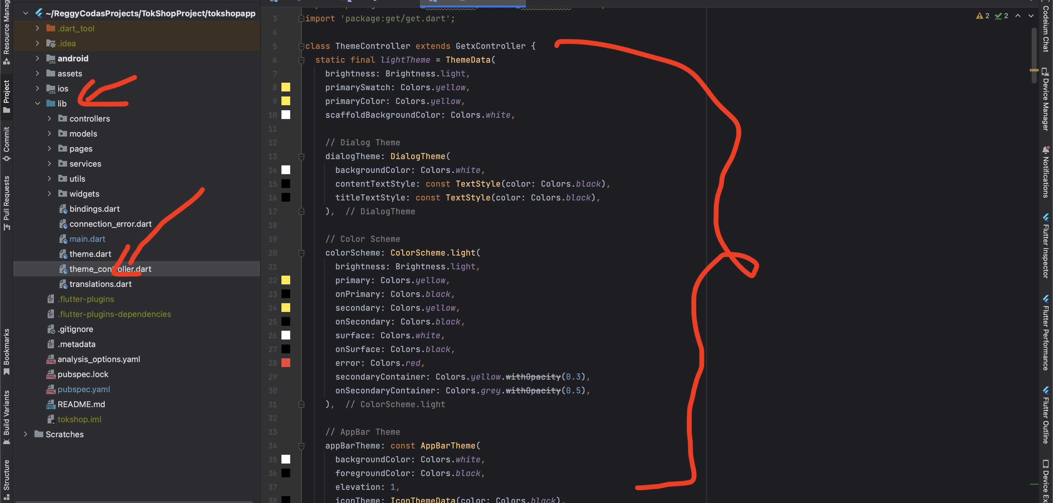 - Go to your project lib > theme_controller.dart as shown in the below image.