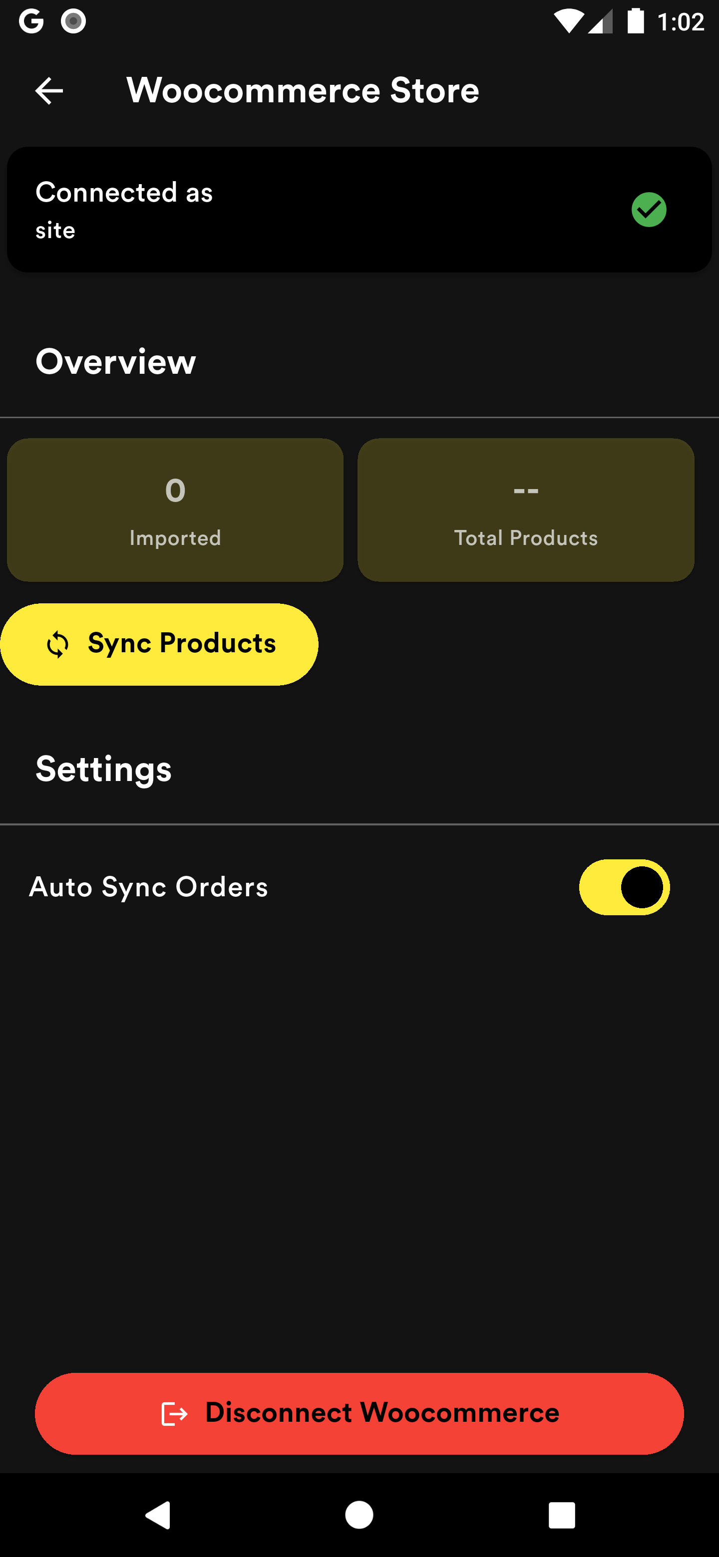 - Click Woocommerce Store and you will now see an overview of your woocommerce store, you can import products and allow/disallow orders sync